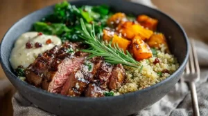 This Steak Quinoa Bowl is a balanced, nourishing meal packed with tender steak, fluffy quinoa, roasted sweet potatoes, and vibrant greens. Finished with a creamy lemon tahini dressing, this bowl delivers bold flavor while keeping things wholesome and satisfying. Whether you need a quick lunch or a hearty dinner, this steak quinoa bowl is a simple and delicious option.