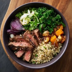 This Steak Quinoa Bowl is the perfect mix of hearty protein, wholesome grains, and vibrant vegetables. With its creamy tahini dressing and naturally sweet roasted potatoes, every bite is flavorful and satisfying. It’s easy enough for busy weeknights yet balanced enough for meal prep throughout the week.