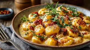 Creamy gnocchi recipe with sun-dried tomatoes and herbs, plated and ready to serve for a cozy meal.