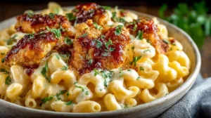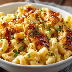 This recipe has everything people love in a family-style meal: crispy chicken, rich homemade mac and cheese, and a sweet-and-spicy finish that makes every bite memorable. It is easy to prepare with simple ingredients, feels restaurant-worthy, and works well for busy weeknights or casual weekend dinners. The mix of creamy pasta and honey pepper sauce chicken makes it especially appealing for both kids and adults.