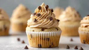 A batch of homemade Cookie Dough Cupcakes with fluffy frosting and chocolate chip garnish. These dessert cupcakes feature a rich edible cookie dough center and golden vanilla cupcake base.