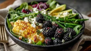 Grilled Corn Salad with Blackberries is a fresh, vibrant dish that brings together smoky, sweet, and tangy flavors in every bite. This easy salad is perfect for warm days, offering a beautiful balance of grilled corn, juicy berries, and creamy avocado.