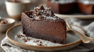 A slice of 4 Ingredient Healthier Chocolate Cake with a rich fudgy texture and deep chocolate color on a plate. The cake looks moist and dense, perfect for a healthy dessert.