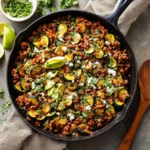 This Ground Beef and Zucchini Skillet is a quick, hearty dinner packed with Mexican-inspired flavors, colorful vegetables, black beans, and melty cheese. It is the kind of easy one-pan meal that delivers comfort, protein, and bold flavor without a lot of fuss.