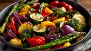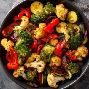 - In a large bowl, toss vegetables with olive oil, garlic powder, salt, and black pepper.